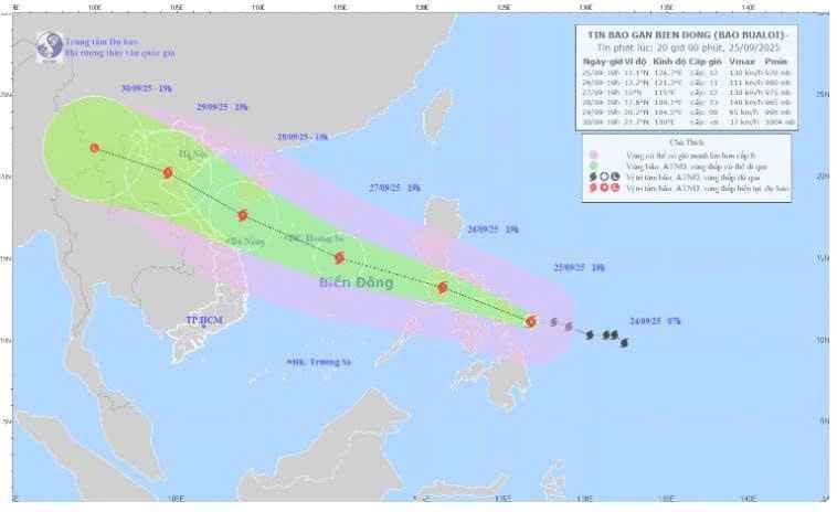 Theo Trung tâm Dự báo Khí tượng Thủy văn Quốc gia, hồi 19h ngày 25/9, vị trí tâm bão ở vào khoảng 11,1 độ Vĩ Bắc; 126,7 độ Kinh Đông, trên vùng biển phía Đông miền Trung Philippines. Sức gió mạnh nhất vùng gần tâm bão mạnh cấp 12 (118-133km/giờ), giật cấp 15. Di chuyển theo hướng Tây Tây Bắc với tốc độ 20-25km/h. Dự báo khoảng đêm 26/9, bão BUALOI sẽ đi vào vùng biển phía Đông khu vực Giữa Biển Đông, trở thành cơn bão số 10 năm 2025.