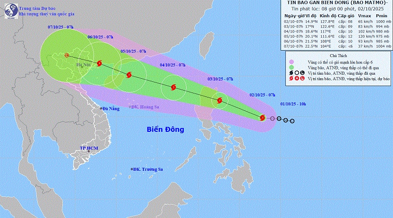 Theo Trung tâm Dự báo khí tượng thủy văn quốc gia, đến 7h, vị trí tâm bão Matmo trên vùng biển phía Đông Philippines. Sức gió mạnh nhất vùng gần tâm bão mạnh cấp 8 (62-74km/h), giật cấp 10. Bão di chuyển theo hướng Tây Tây Bắc, tốc độ 15-20km/h.