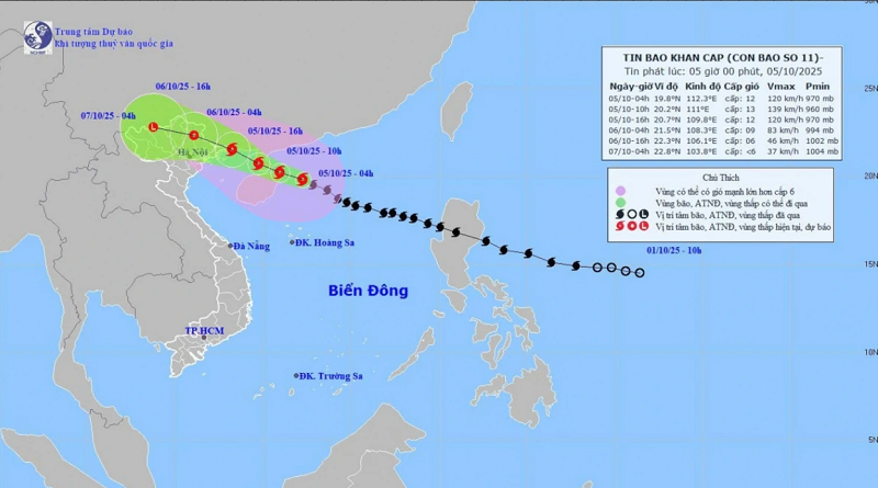06:39, 05/10/2025Theo Trung tâm khí tượng thủy văn Quốc gia, hồi 4h sáng nay (5/10), tâm bão số 11 ở khoảng 19,8 độ Vĩ Bắc; 112,3 độ Kinh Đông, trên vùng biển Tây Bắc khu vực Bắc Biển Đông, cách đảo Hải Nam (Trung Quốc) khoảng 150 km về phía Đông và cách Quảng Ninh khoảng 550 km về phía Đông Đông Nam. Sức gió mạnh nhất gần tâm bão đạt cấp 12 (118-133 km/giờ), giật cấp 15. Bão di chuyển theo hướng Tây Tây Bắc với tốc độ 20-25 km/giờ.