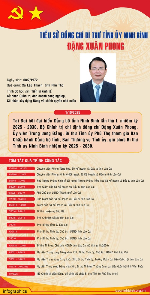 Ngày 1/10, Đại hội Đảng bộ tỉnh Ninh Bình lần thứ I, nhiệm kỳ 2025-2030, đã công bố Quyết định của Bộ Chính trị về việc chỉ định đồng chí Đặng Xuân Phong, Ủy viên Trung ương Đảng, Bí thư Tỉnh ủy Phú Thọ giữ chức vụ Bí thư Tỉnh ủy Ninh Bình nhiệm kỳ 2025-2030.