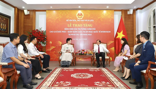 Chiều 26/9, tại trụ sở Bộ Văn hóa, Thể thao và Du lịch, Thứ trưởng Tạ Quang Đông đã trao Bằng khen của Thủ tướng Chính phủ cho ca sĩ Đức Phúc, Quán quân Cuộc thi Âm nhạc Quốc tế Intervision 2025 tổ chức tại Moscow, Liên bang Nga. Đây là giải thưởng danh giá, ghi dấu mốc lần đầu tiên một ca sĩ Việt Nam bước lên ngôi vị cao nhất tại sân khấu âm nhạc có uy tín lâu đời ở châu Âu.