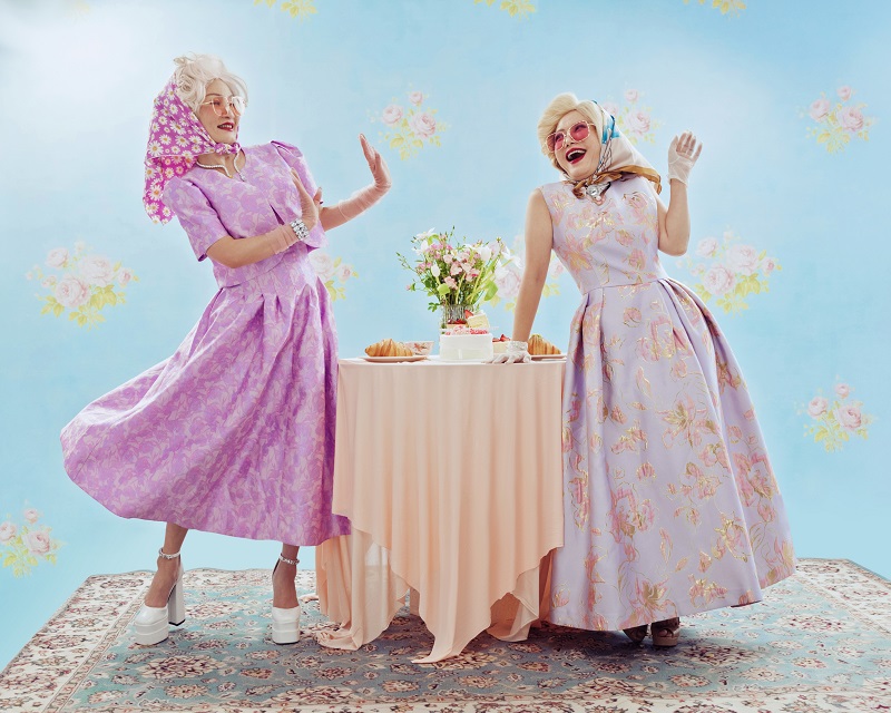 Trong khung cảnh ấy, Việt Hương và Hồng Đào hóa thân thành hai “quý bà” hiện đại, thanh lịch, sang trọng nhưng không kém phần dí dỏm khi hai nghệ sĩ gạo cội diện váy hoa pastel ánh kim được thiết kế riêng, tôn dáng và phù hợp với phong cách cổ điển mà vẫn giữ được nét trẻ trung. Các phụ kiện như găng tay ren, chuỗi ngọc trai, kính râm màu hồng và khăn lụa góp phần hoàn thiện hình ảnh của hai “bà thơ” vừa cổ điển, vừa thời thượng.