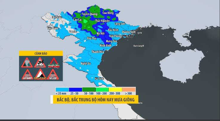 Dự báo từ sáng đến chiều nay, mưa giông sẽ xảy ra ở các tỉnh, thành khác của Bắc Bộ gồm Thủ đô Hà Nội và khu vực Thanh Hóa – Hà Tĩnh. Cảnh báo có nơi mưa to trên 80mm, đề phòng kèm theo gió lốc, giông sét và mưa đá. Nhiệt độ giảm từ 2 – 5 độ C so với chiều qua, cao nhất nhiều nơi không quá 31°C.