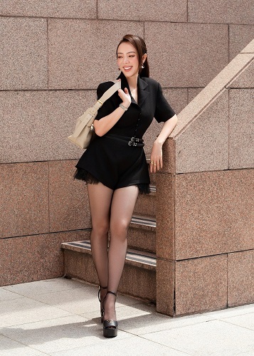 Trong khi đó, chiếc đầm đen với phần cổ dạng vest khoét sâu giúp Thu Trang vừa giữ nét thanh lịch, vừa tạo vẻ cuốn hút. Form váy ngắn kết hợp cùng tất đen, cũng góp phần giúp nữ nghệ sĩ “hack tuổi”.