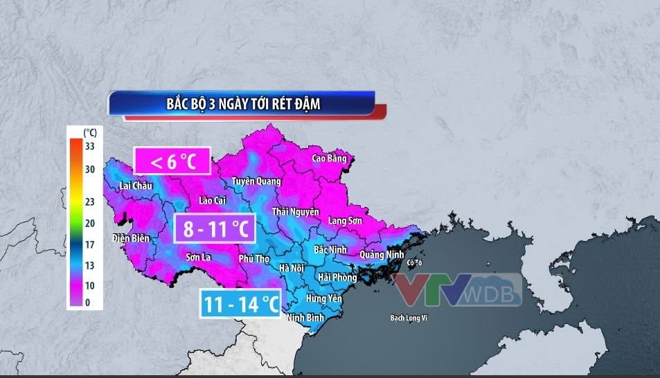 Nhiệt độ ban ngày khoảng 12 – 18 độ C. Đêm và sáng sớm, nhiệt độ thấp nhất 11 – 13 độ C, vùng núi 8 – 11 độ C, ở vùng núi cao có nơi dưới 6 độ C. Dự báo rét đậm sẽ kéo dài đến thứ Sáu (23/1).