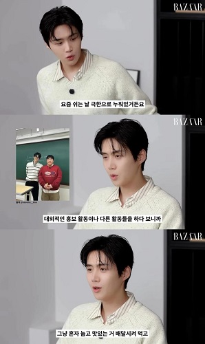 Anh ấy nói thêm rằng sau khi phải xoay xở với việc quay phim, tập kịch và các hoạt động quảng bá, anh ấy chỉ có một hoặc hai ngày nghỉ ngơi, và anh ấy thích dành thời gian đó một mình, nằm thư giãn và gọi đồ ăn giao tận nhà.
