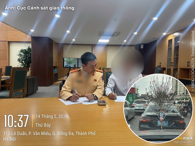 Trước đó, người dân phản ánh tới đường dây nóng của Cục trưởng Cục CSGT và mạng xã hội “Giao thông văn minh” về việc ô tô biển xanh 80A-062.xx buộc cành đào Tết làm che lấp biển số. Đội Khai thác, xử lý vi phạm thuộc Phòng Quản lý, khai thác, xử lý, vận hành dữ liệu và chuyển đổi số (Cục CSGT) đã tổ chức xác minh. Kết quả cho thấy vào hồi 16 giờ ngày 13/02, tại đường Lạc Long Quân, phường Tây Hồ, Hà Nội, ô tô biển số 80A-062.xx (nền xanh, chữ trắng) có hành vi gắn biển số xe bị che lấp.